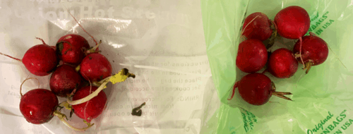 The radishes stored in the Green Bags showed little to no deterioration over the three weeks.